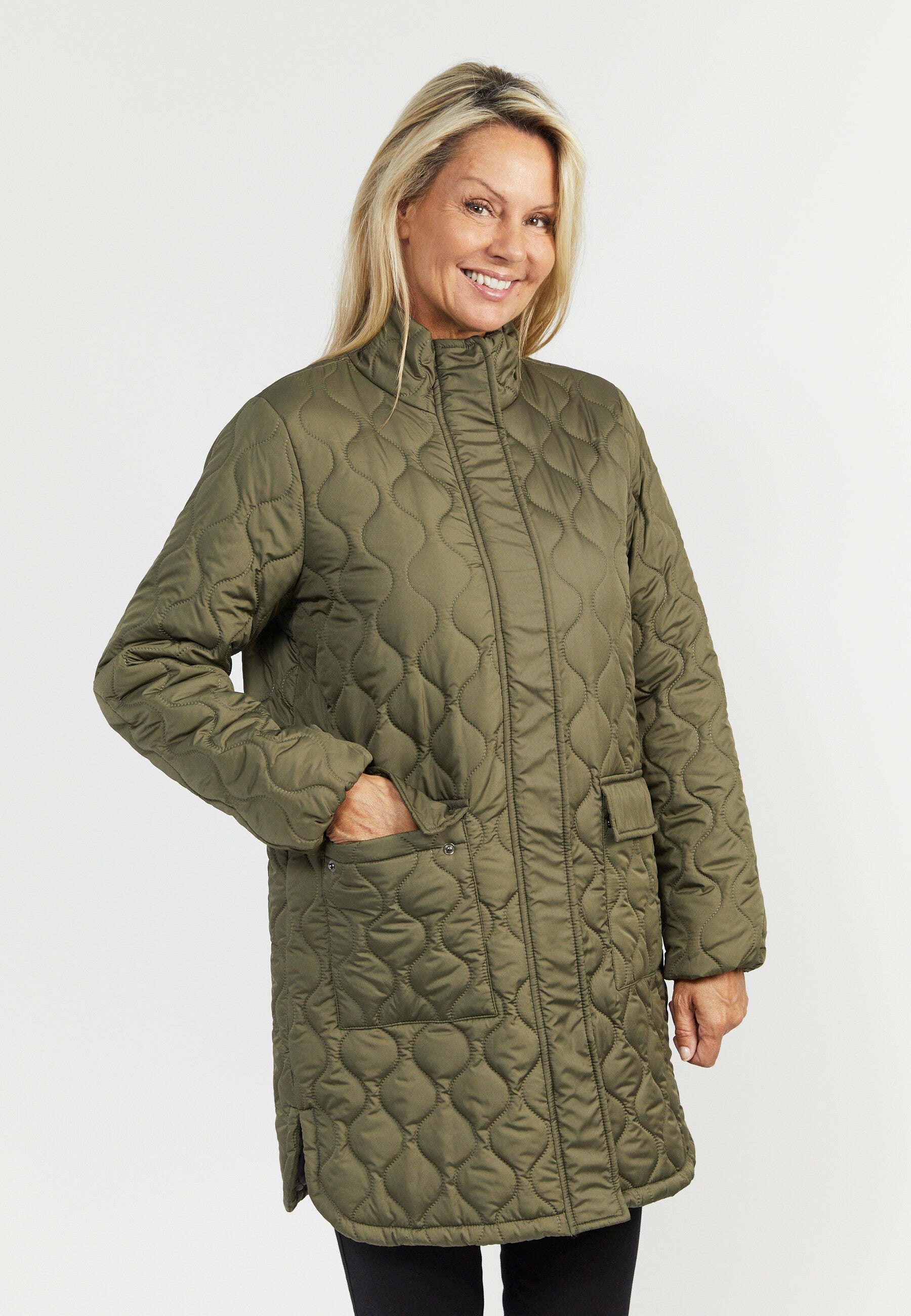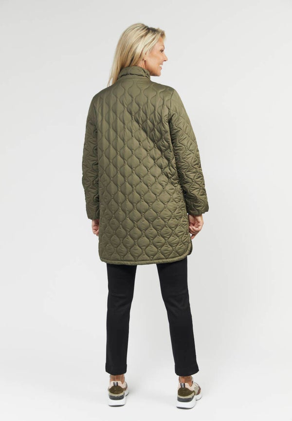 Prachtige, warme en knielange jas met een hoge hals. De jas heeft een voering en sluit met een rits en knopen, en heeft 2 voorzakken die ook sluiten met knopen. De jas heeft splitten aan beide zijkanten om bewegingen gemakkelijker te maken. De jas heeft 2 binnenzakken voor kleine spullen.