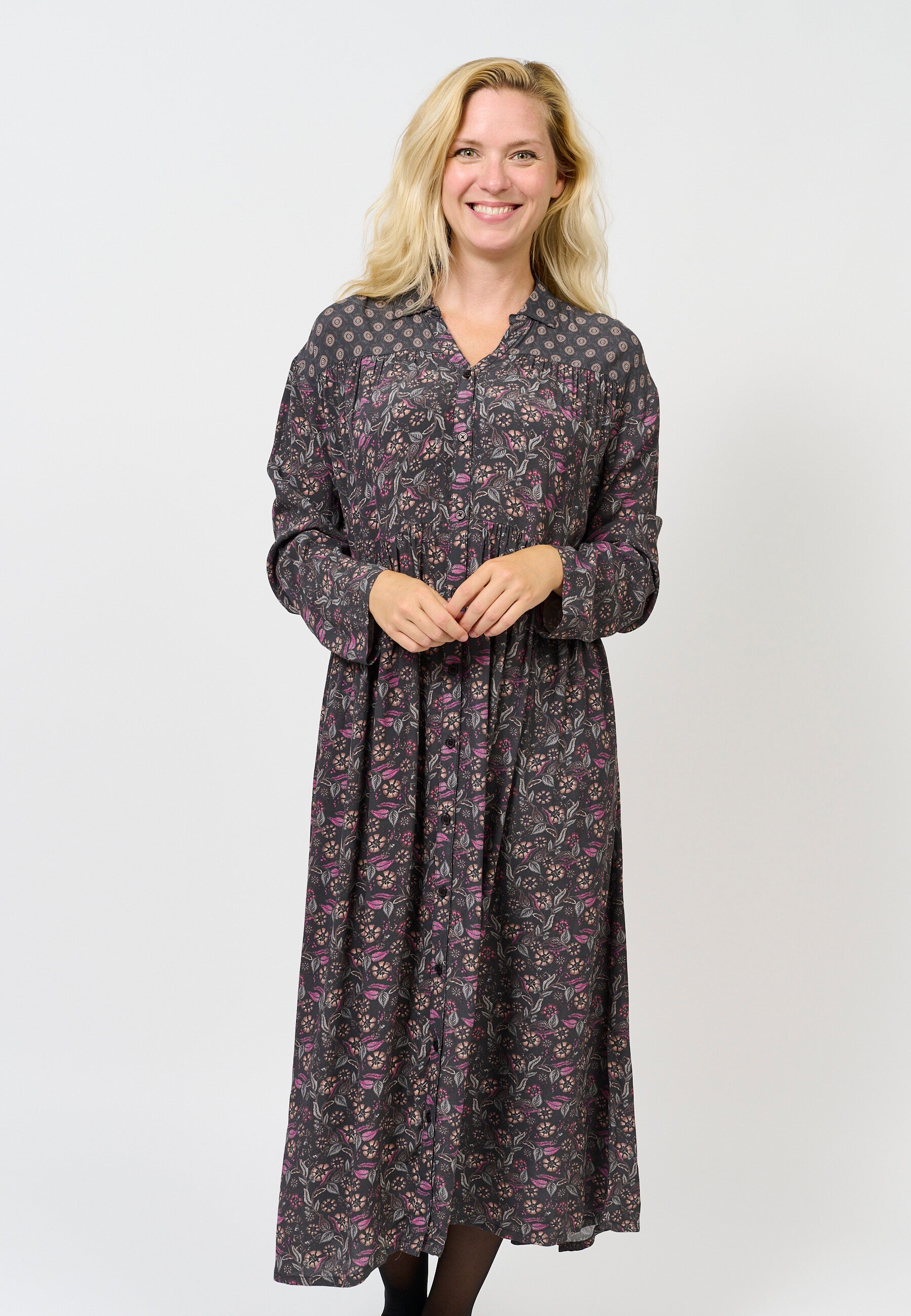 Mooie jurk met veel leuke features. Het is gemaakt van een fantastische viscose kwaliteit die heerlijk draagt en heeft een mooie A-snit waardoor het losjes langs je lichaam valt. Het is gecombineerd van textiel met 2 verschillende patronen die prachtig harmoniëren in kleur en vorm. De 2 verschillende patronen zorgen voor een chique en moderne look. Het heeft een klassieke overhemdkraag en sluit met een kleine knoop aan de voorkant.